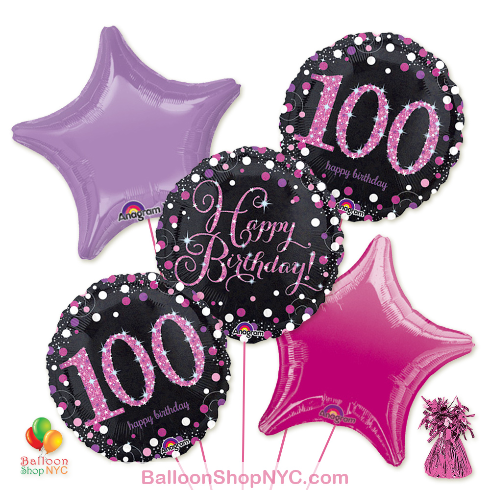 Bright & Shiny 100 Pretty Pink Happy Birthday Mylar Stars Balloon Bouquet Inflated, matching color balloon weight included – perfect for Birthday gift and Party decoration. Combine with our foil Solid color shapes and Latex balloons from Pink collection.